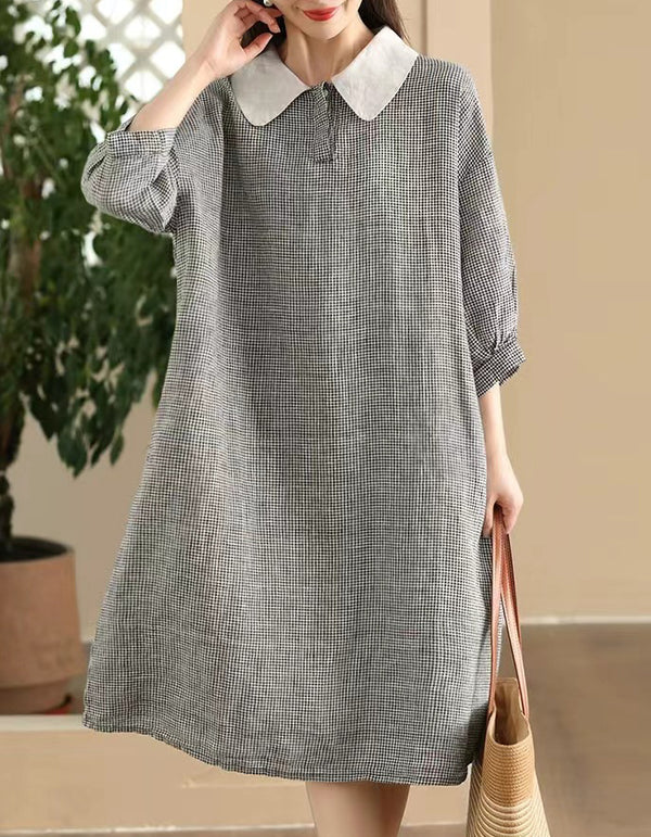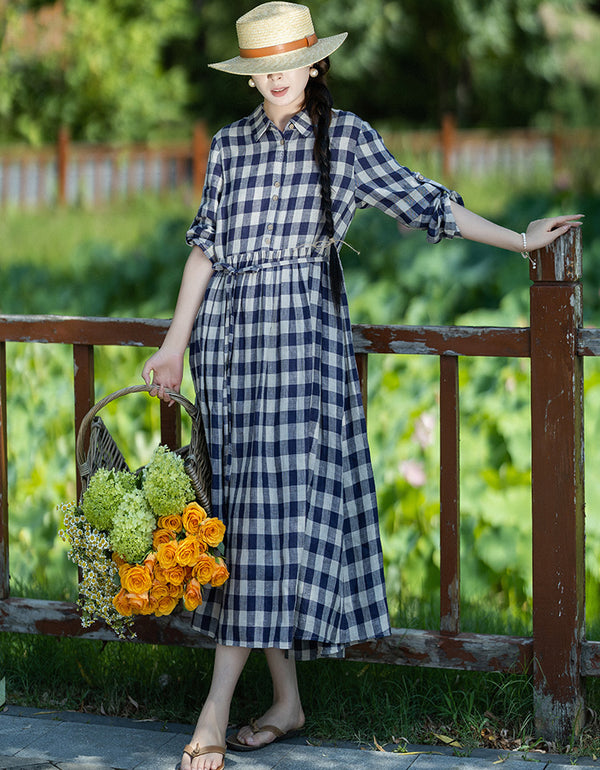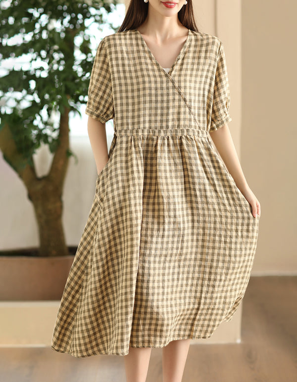 Casual Plaid V-Neck Short Sleeve Linen Midi Dress