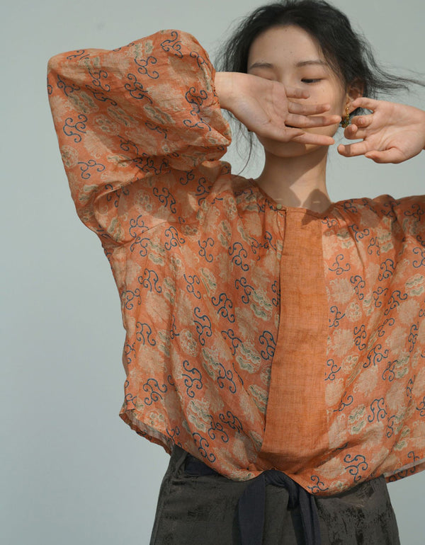 Vintage Floral Lantern Sleeve Loose Linen Blouse