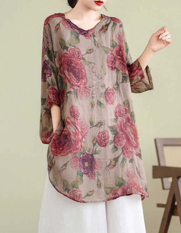 Orange Flower Mandarin Collar Large Size Floral Dress