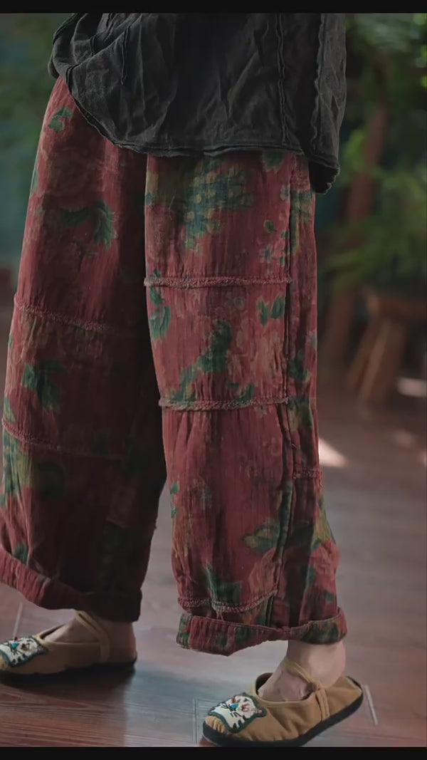 Retro Flower Print Casual Loose Wide Leg Pants Red