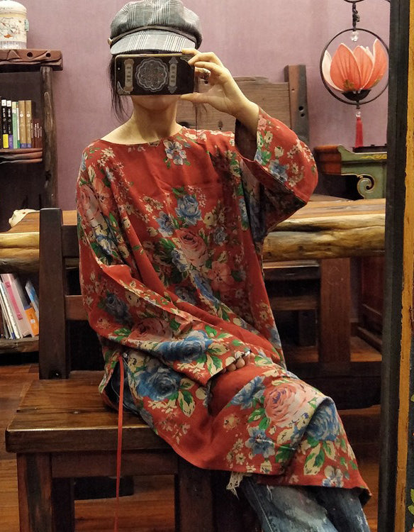 Ethnic Style Side Slit Retro Red Flower Printed Dress Robe
