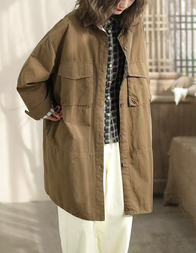 A minimalist long jacket with a relaxed fit, large pockets, and casual streetwear style. Perfect for layering in any season.