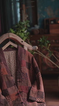 A cozy vintage-inspired patchwork coat featuring warm earthy tones, soft textured fabric, and traditional toggle details—perfect for adding artistic charm to your everyday style.