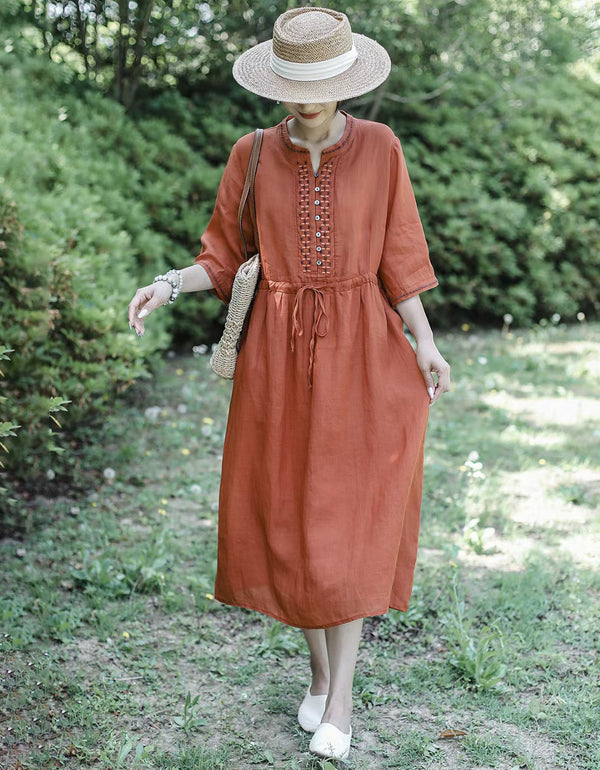 Orange Flower Mandarin Collar Large Size Floral Dress