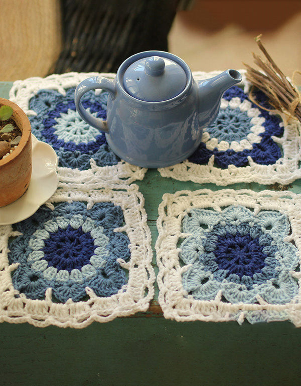 Set de table carré vintage au crochet avec fleurs bleues (4 pièces)