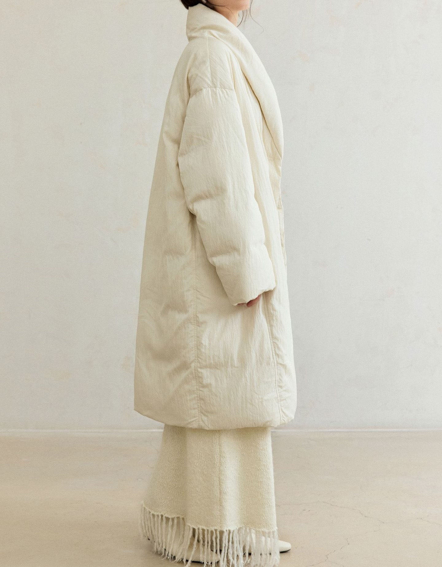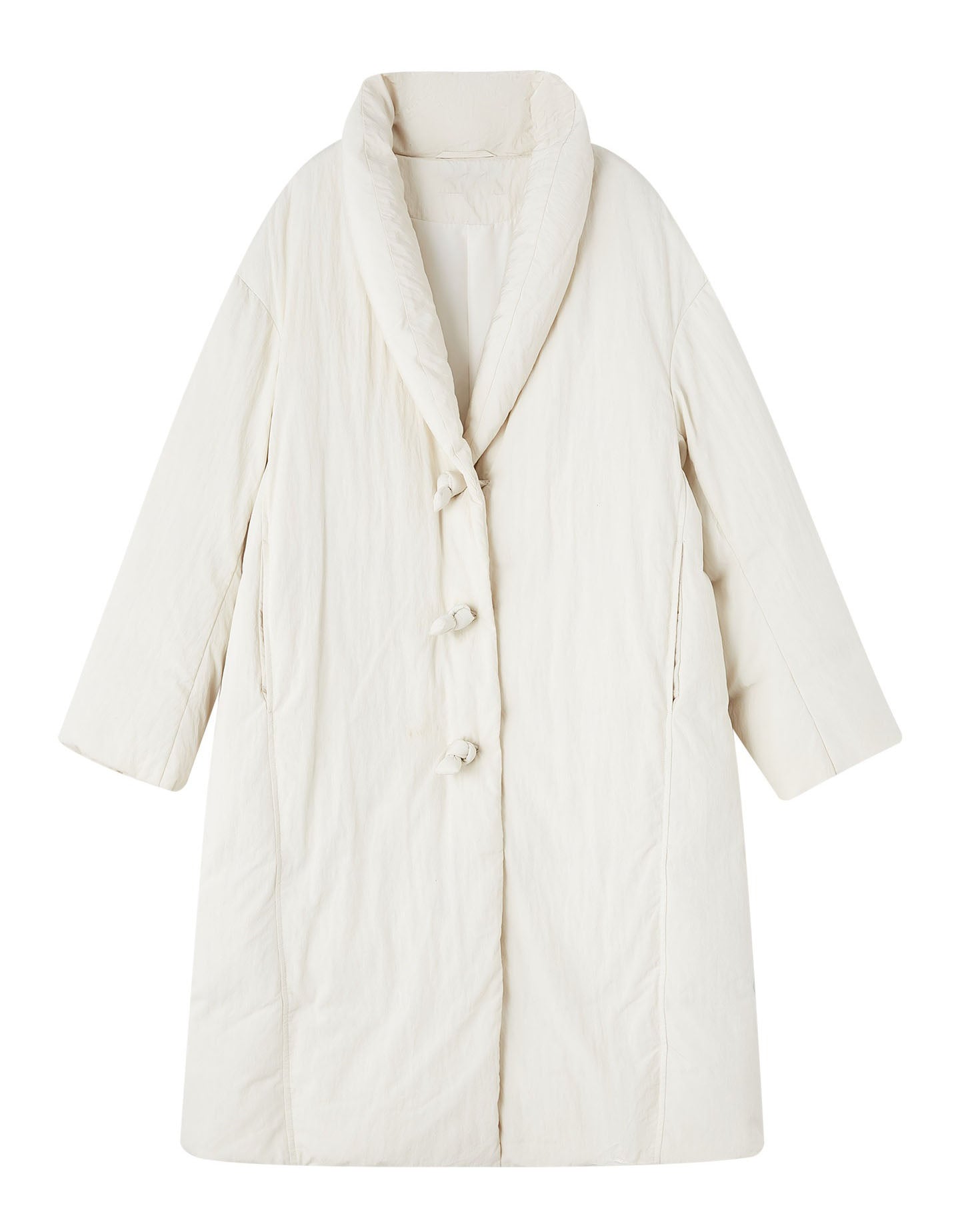 Stay effortlessly warm in this long padded coat, featuring a soft, textured finish, roomy silhouette, and cozy wrap-style front. Perfect for winter layering with a modern, minimalist look.